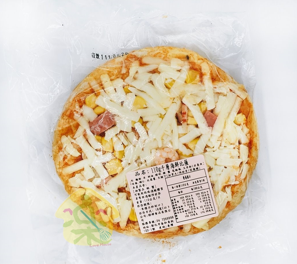 千層海鮮口味內含:蟹味絲、蝦仁、火腿丁、玉米粒、pizza醬、起司選用獨家製作的酥脆千層餅皮餡料澎湃、起司滿滿滿,帶著濃郁誘人香氣,牽絲的模樣更是扣人心弦!烤箱加熱,即可食用,方便快速,適合一人獨享即時品嘗的好滋味~商品規格:110 g / 片