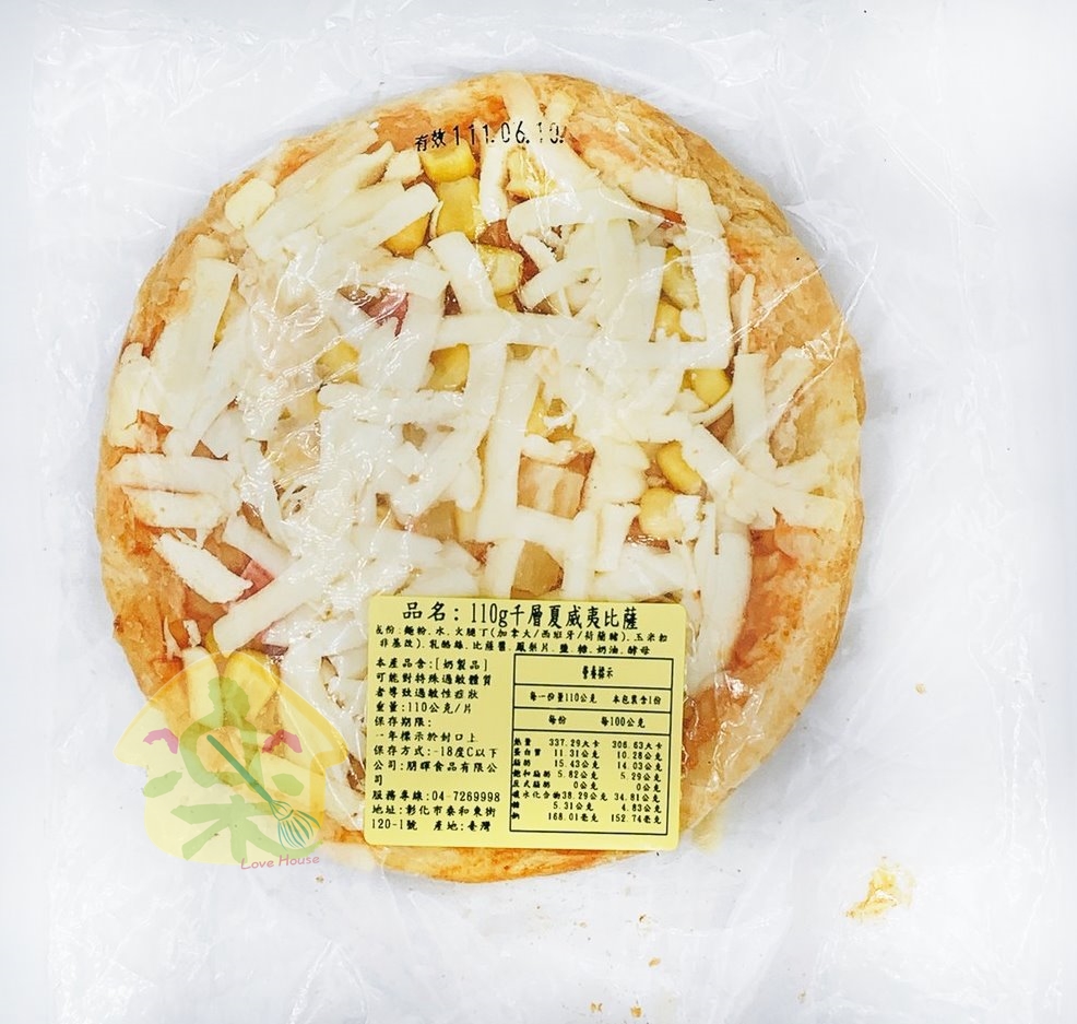 千層夏威夷口味內含:鳳梨片、玉米粒、火腿丁、pizza醬、起司選用獨家製作的酥脆千層餅皮餡料澎湃、起司滿滿滿,帶著濃郁誘人香氣,牽絲的模樣更是扣人心弦!烤箱加熱,即可食用,方便快速,適合一人獨享即時品嘗的好滋味~商品規格:110 g / 片