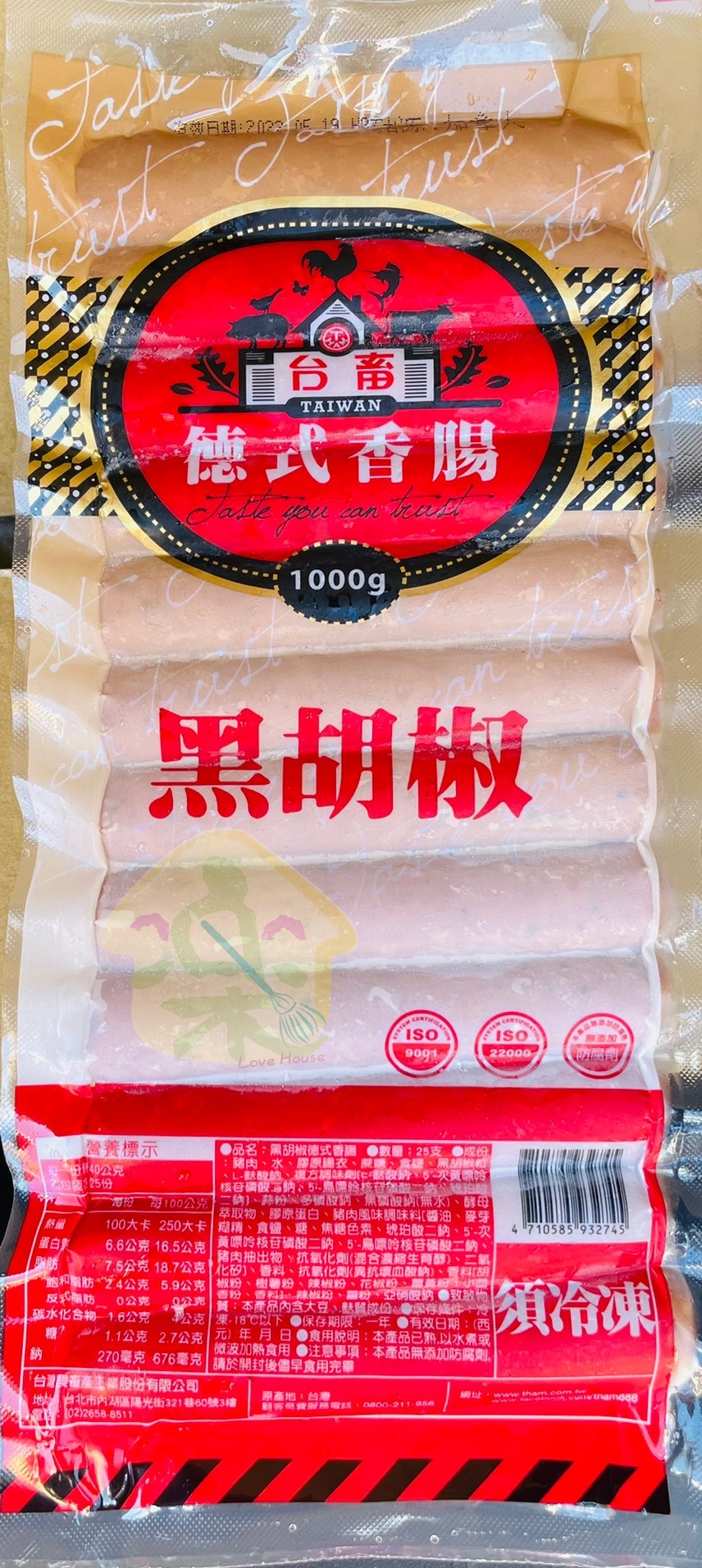 純肉製成,無添加澱粉及其他增量劑。以台畜特殊技術呈現粗顆粒肉質, 咬感扎實,鮮脆多汁。天然黑胡椒粒勾勒自然辛香口味,為西式香腸之極品,料理輕鬆、吃法多元,適合直接享用、也是各種創意料理的絕佳食材。商品規格:25條/包